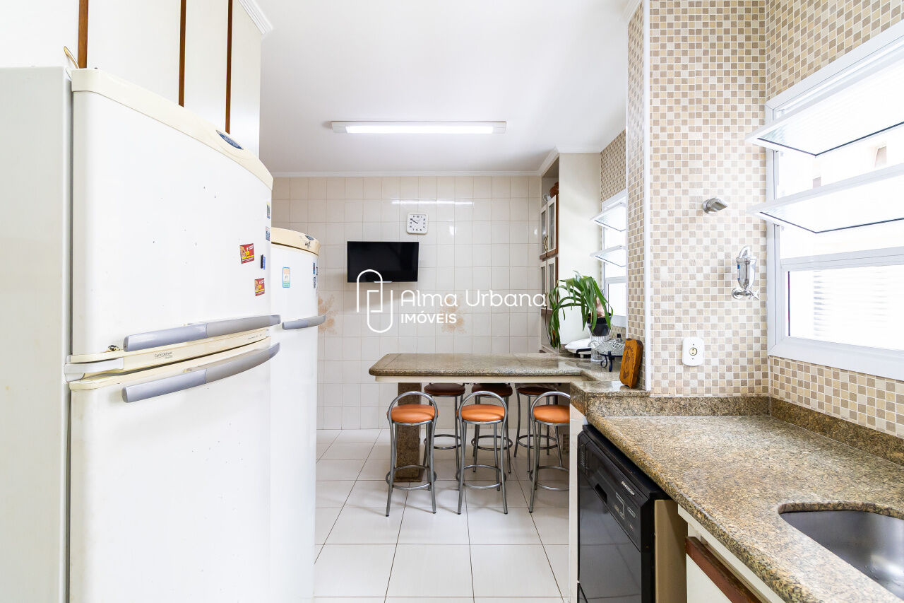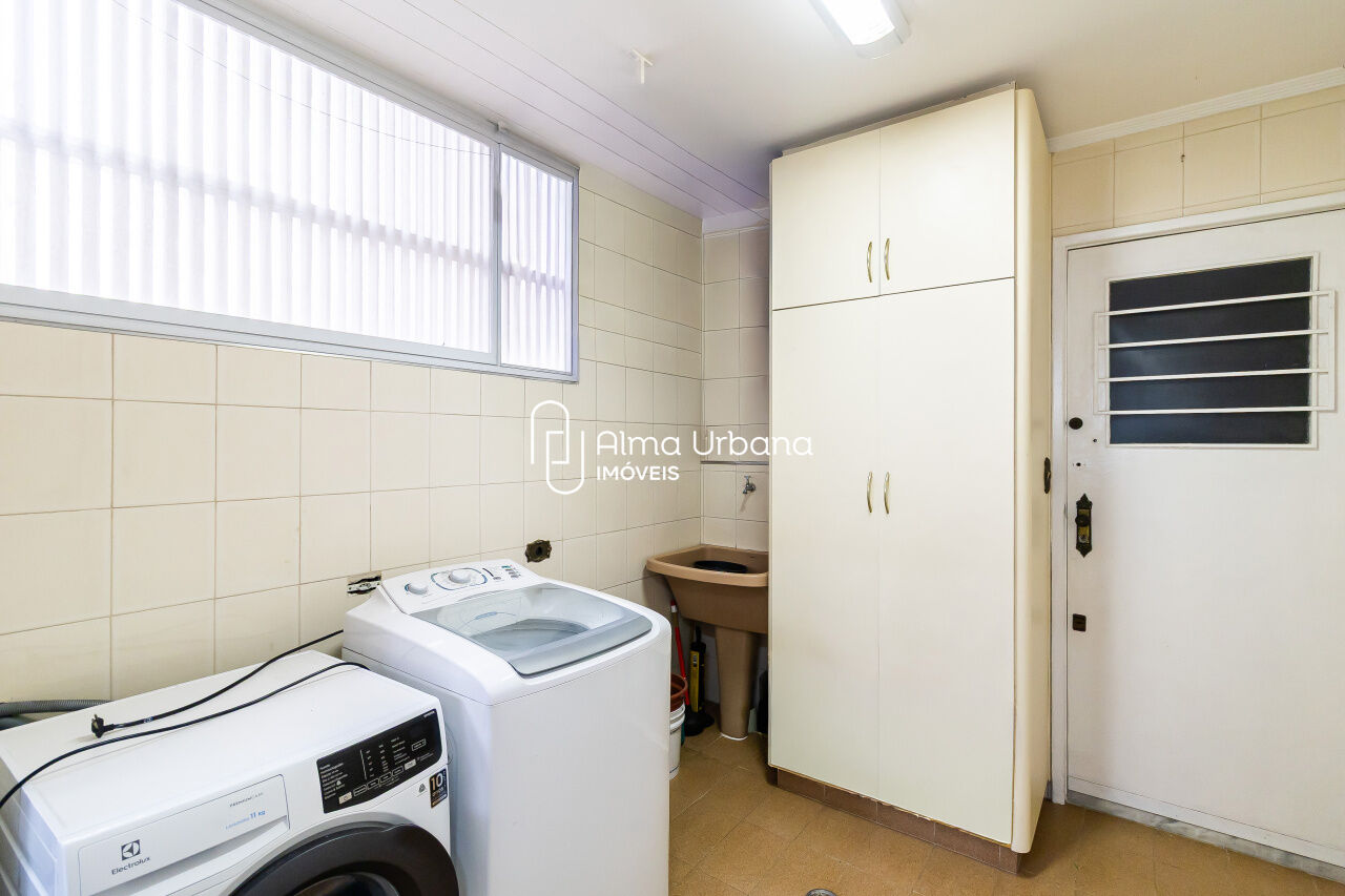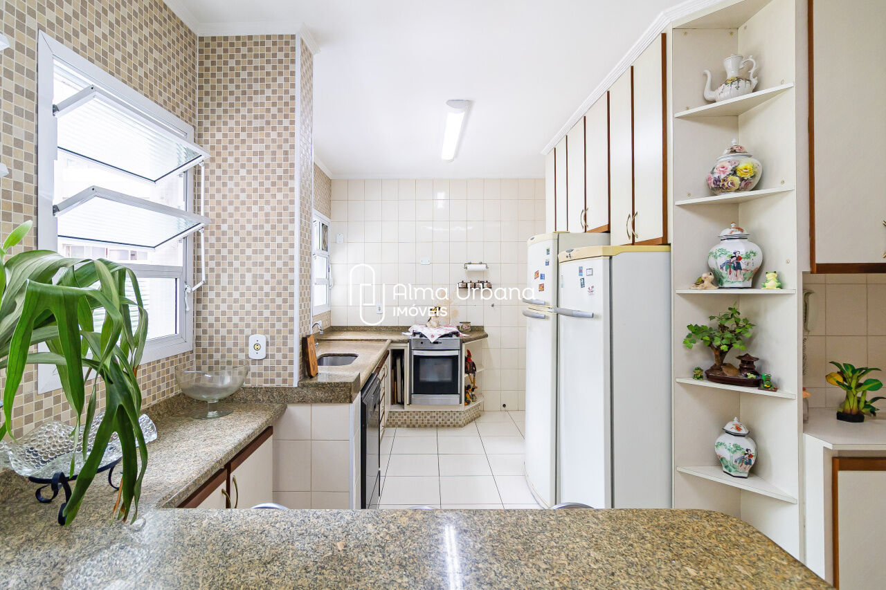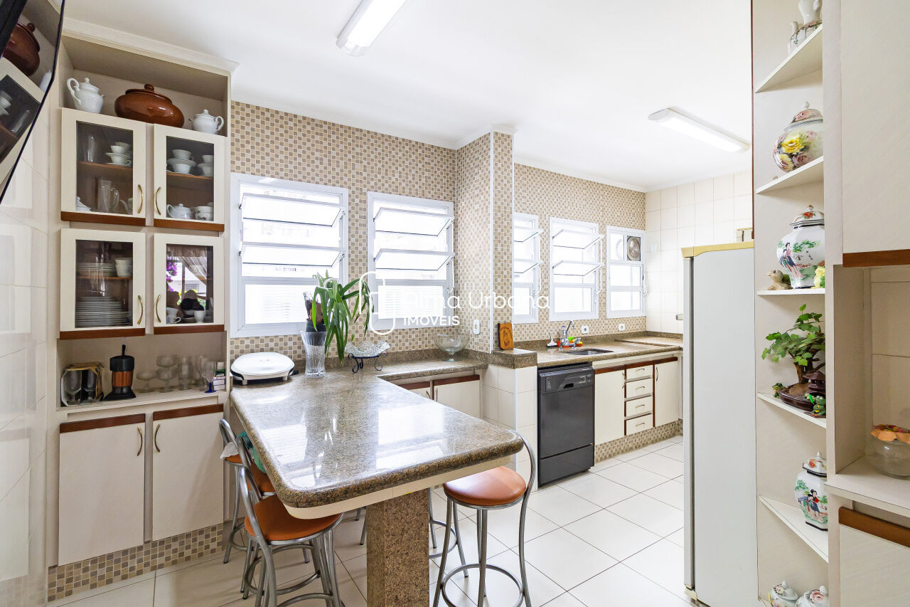 A cozinha tem janelas por toda a extensão e é tão ampla que comporta uma copa. Possui ainda área de serviço e dependência completa.